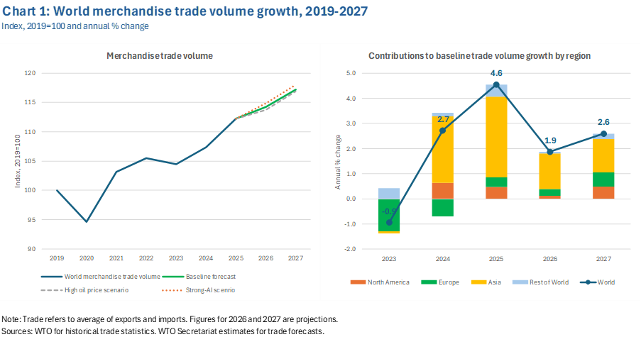 The report finds that merchandise trade volume growth would drop from 4.6% in 2025 to 1.9% in 2026 before picking up to 2.6% in 2027 while services trade volume would see growth easing from 5.3% in 2025 to 4.8% in 2026, then rising to 5.1% in 2027.